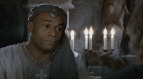 A character from Kaamelott, the Eunuque, sitting in front of candles with the word 'SYMPA' displayed.