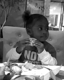Kaavia enjoys a tasty burger at the table, wearing a shirt that says 'NO INTERESTED' in this black and white clip.