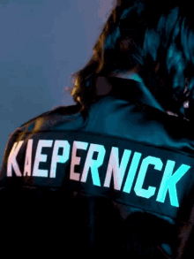Colin Kaepernick showcases a stylish black jacket with 'KIEPERNICK' emblazoned on the back in reflective letters.