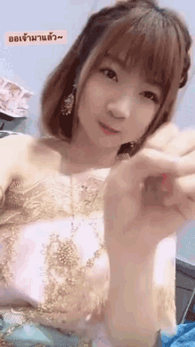 Kaimookbnk48 smiles and waves in a beautiful pink and gold dress, greeting viewers.