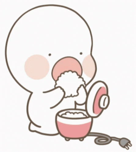 A cute Kakaotalk Emoticon, Ompangie, happily eats rice from a pink mini rice cooker.