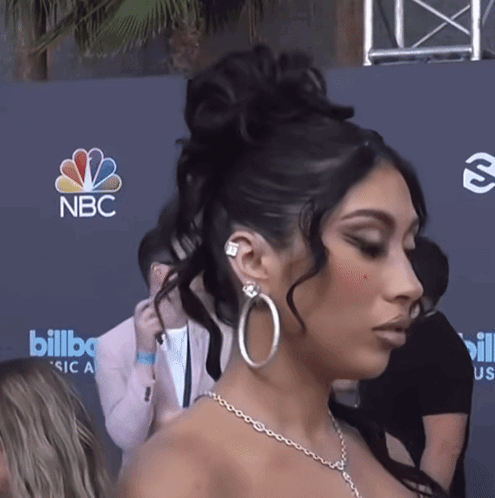 Kali Uchis on the red carpet, wearing large hoop earrings and a stylish updo at the Billboard Music Awards.