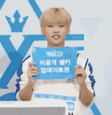 Kang Seokhwa holds a blue sign with 'Unreleased selfie update ticket' in Korean.