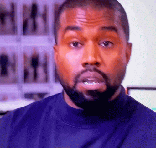 Kanye West blinks slowly, looking annoyed while wearing a dark purple turtleneck shirt and beard.