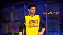 Karan Kundrra smiles, wearing a yellow 'Khatra Khatra Khatra' shirt with 'You are right' text on screen.