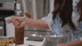 Karen Fukuhara takes a delicious bite of food, smiling and enjoying her meal in a blue floral dress.