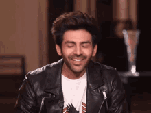 Kartik Aaryan, the popular actor, shares an infectious smile and laugh while wearing a stylish black leather jacket.