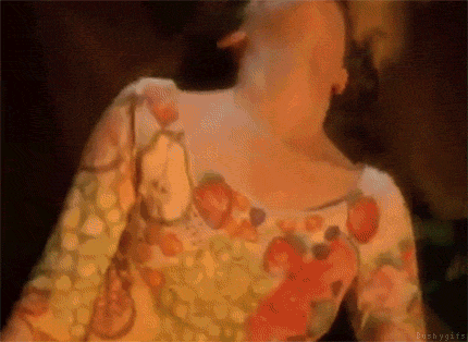 Kate Bush appears to collapse or be extremely tired, captured in a close-up shot.