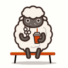 A cute kawaii anime sheep character sits on a bench, enjoying snacks and a drink.