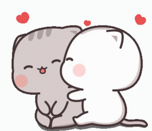 Two adorable Mochi Mochi Peach Cats nuzzle affectionately with hearts and sparkles floating above them.