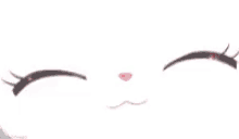 A cute, cartoonish white face with large, shiny red eyes, a small pink nose, and a pink tongue playfully sticking out.