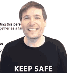 A man in a black shirt with 'KEEP SAFE' text, smiling and promoting caution and safety.