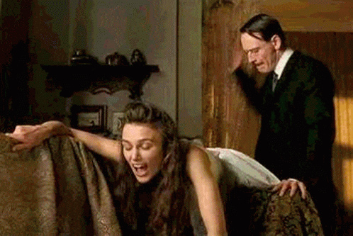 Keira Knightley and Michael Fassbender in an intense scene, with him standing over her.