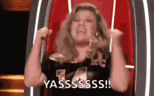 Kelly Clarkson, a coach on The Voice, reacts with extreme enthusiasm, exclaiming 'YASSSSSS!!' while sitting in her chair.