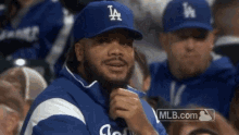 Kenley Jansen, wearing a Dodgers hat and jacket, smiles while watching a baseball game.
