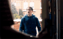 Khana, wearing a blue hoodie, stands in a doorway and says 'Hi' as rain falls outside.