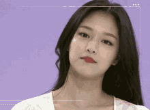 Kim Hyunjin of Loona looking charming with a subtle smile against a purple background.