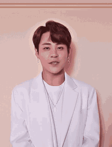 Kim Taeho smiling charmingly in a white blazer and necklace, showcasing his 'uwu' charm.