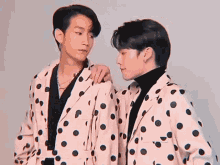 Kimmon and Copter (KimCop) posing together in matching pink polka dot blazers, looking at each other.