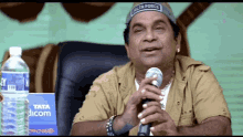 Brahmanandam, wearing a Delta Force hat, smiles and speaks into a microphone, with 'Adey Majiccu' on screen.