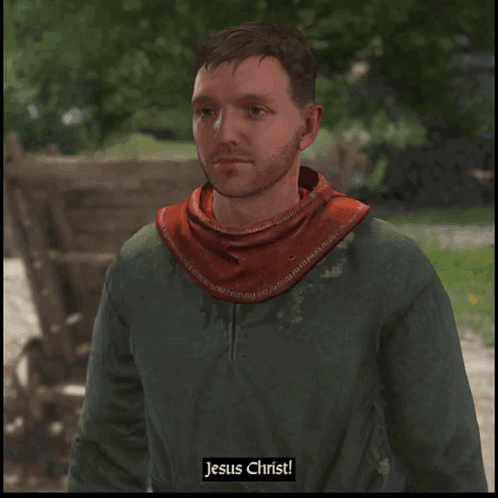 Henry from Kingdom Come: Deliverance reacts with 'Jesus Christ!' in a medieval setting.