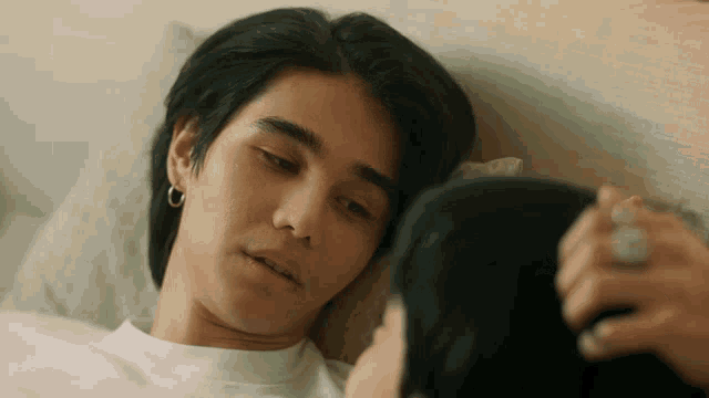 Kim (Jeff Satur) from Kinnporsche expresses his hunger while lying in bed next to Porschay (Barcode).