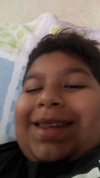 Close-up of a child with dark hair, eyes closed, smiling peacefully while lying down.