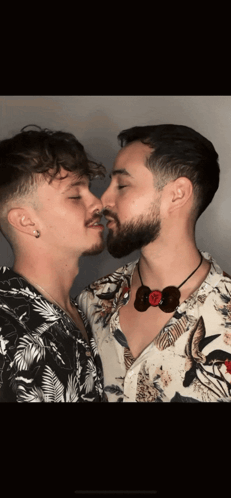 Two men share a passionate kiss, one with a beard and the other with curly hair, in a close-up shot.