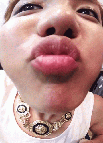 Close-up of a person making a kissing face, wearing a distinctive gold chain Versace necklace.