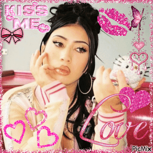 Kali Uchis poses with a Hello Kitty item, surrounded by glittery pink 'Kiss Me' and 'Love' graphics.