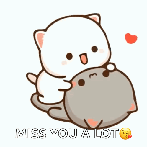Adorable cartoon cats, one white and one grey, hug affectionately with the message 'MISS YOU A LOT'.