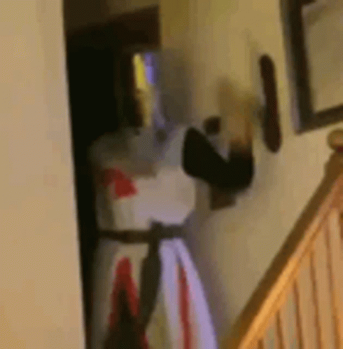 A person in a full knight or crusader costume stands in a doorway, holding a rifle.