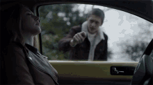 Taissa Farmiga as Annie Miller sits in her car while a man knocks on the window, trying to get her attention in The Twilight Zone.