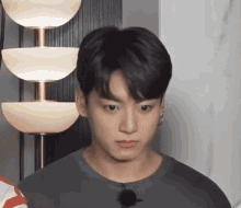 Koogimins Jungkook captured in a thoughtful moment, looking down with a serious expression.