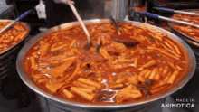 Serving delicious and spicy Korean street food, Tteokbokki, from large simmering pots, a popular dish.