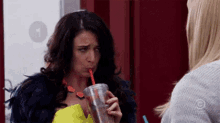 Two women from Kroll Krollshow enjoying drinks with straws in a casual indoor setting.