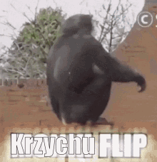 A chimpanzee named Krzychu performs an impressive backflip from a wall onto the grass.