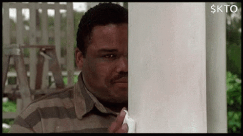 A man in a striped shirt peeks from behind a white pillar, watching intently, often used as a KTO meme.