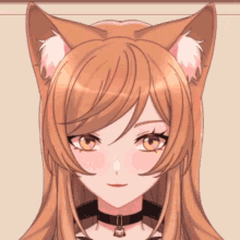 Kyo Koro, an anime girl with cat ears, smiles and blinks, wearing a black choker with a padlock.