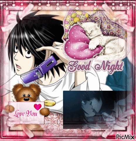 L from Death Note holds a phone, with a sleeping cat, 'Good Night' message, and 'Love You' teddy bear.