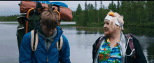 Two hikers, one in a blue jacket and another in a colorful shirt, stand by a lake in Lapland.