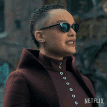 Fei (Britne Oldford) from The Umbrella Academy, in sunglasses and a red coat, delivers a stern 'Last Warning'.