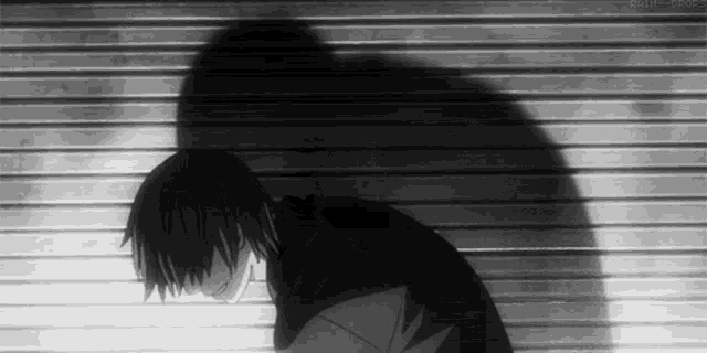 An anime character with glowing red eyes looks up, laughing hysterically against a dark, striped background.