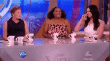 Laura Prepon and two other women sit at a table on 'The View' set, engaging in conversation during a talk show segment.