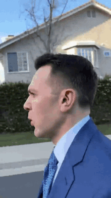 Mike, a man in a sharp blue suit and tie, walks confidently down a suburban street on a sunny day.