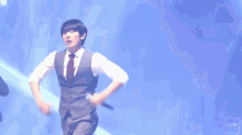 Lee Joon delivers an energetic performance on stage, dressed in a stylish suit and tie.