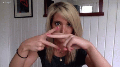A woman with blonde hair makes a scissor finger gesture, looking directly at the camera.