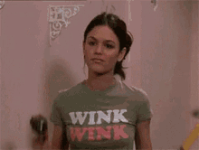 Woman in 'Wink Wink' shirt holding a power drill and a hammer, ready for action.