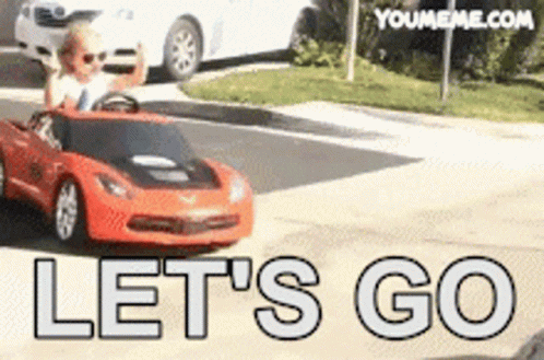 An excited child in sunglasses drives a red toy car, raising arms with 'LET'S GO' text overlay.
