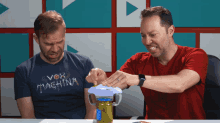 Liam O'Brien and Sam Riegel intensely try to open a pickle jar with an automatic opener, showing frustration.